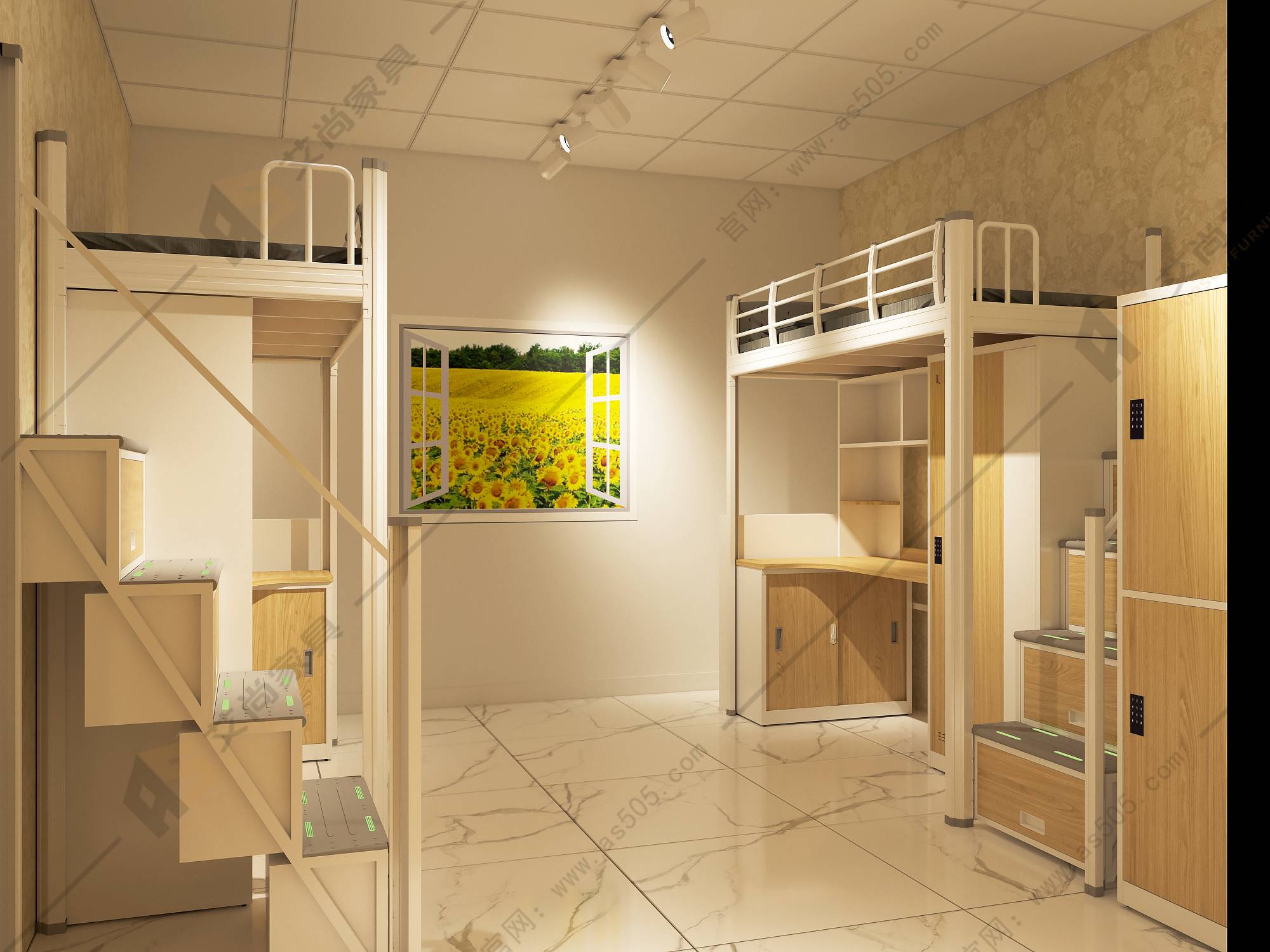 公寓床上方是睡眠休憩區(qū),而下方給了學生更多私人空間,邊上的儲物柜可以收納書籍、衣物,也可以擺放喜愛的物品 。