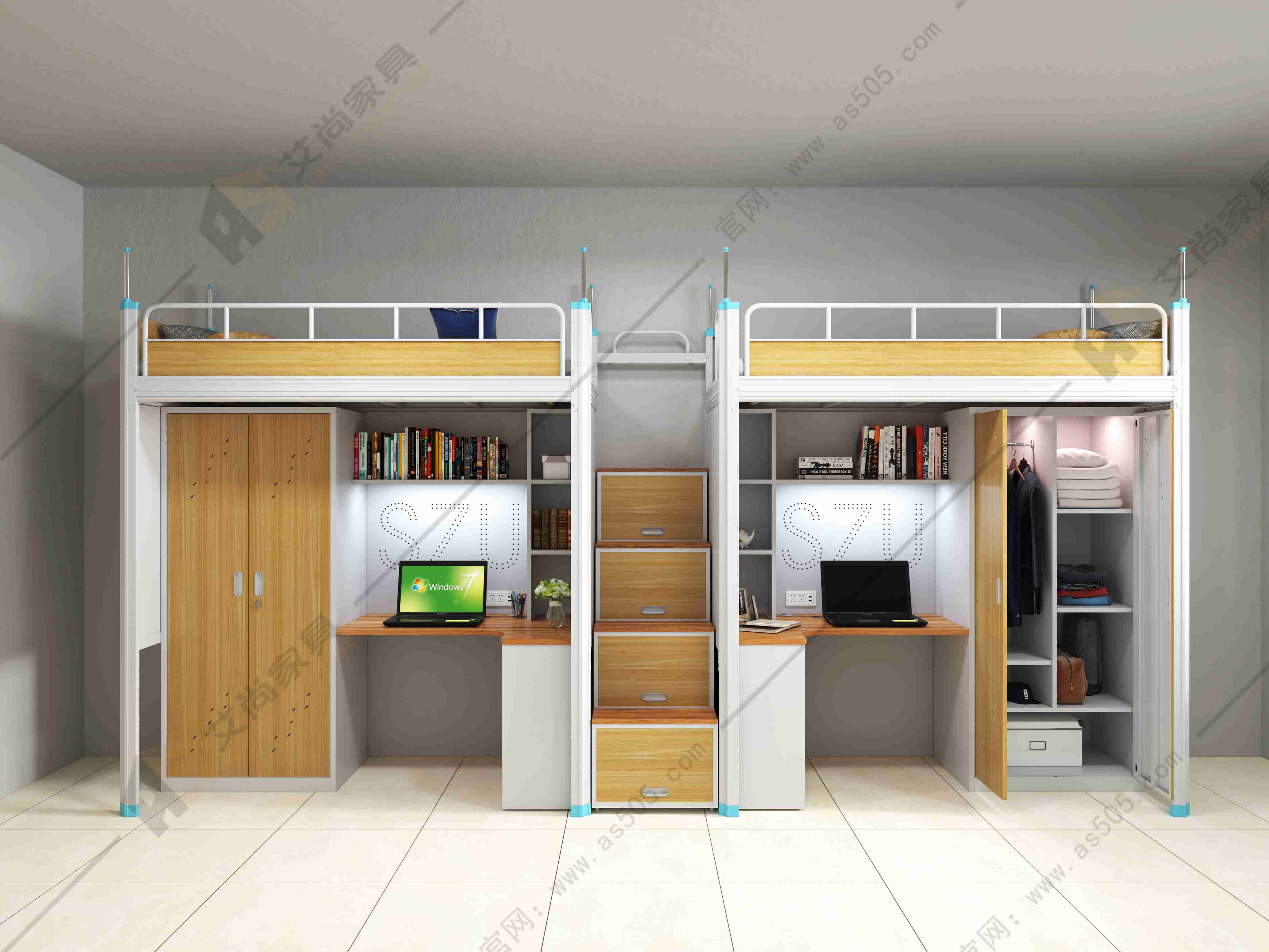宿舍空間狹小,學生生活用品須在宿舍內(nèi)整理妥當,宿舍公寓床需考慮空間利用率,上面是休息區(qū),下面是學習區(qū),衣柜,鞋柜,柜格等都可以提出方案和要求,定制宿舍公寓床。