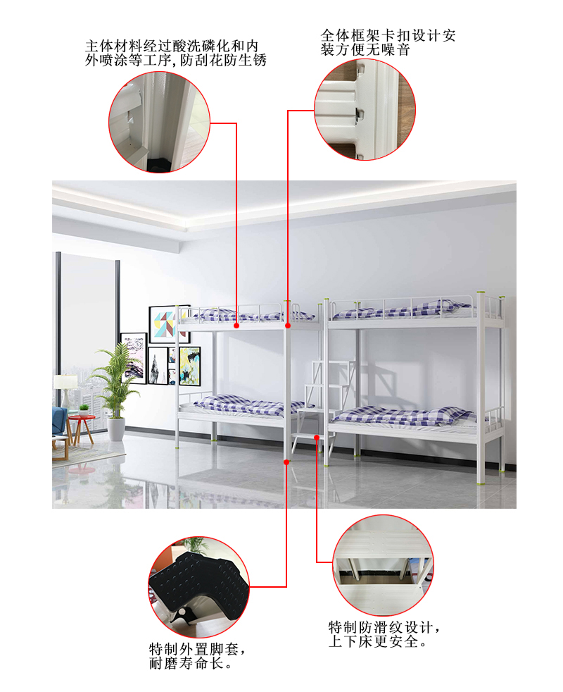 上下鋪鐵床表面全自動(dòng)噴粉處理,0甲醛;中空異型結(jié)構(gòu),卡扣式連接、無螺絲;100%冷軋鋼板不參假。真正的良心企業(yè)!